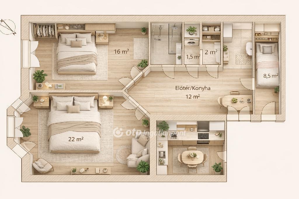 Az ingatlan elosztása kiváló: 2 külön nyíló hálószoba, tágas nappali, étkezős konyha, fürdőszoba és külön WC.