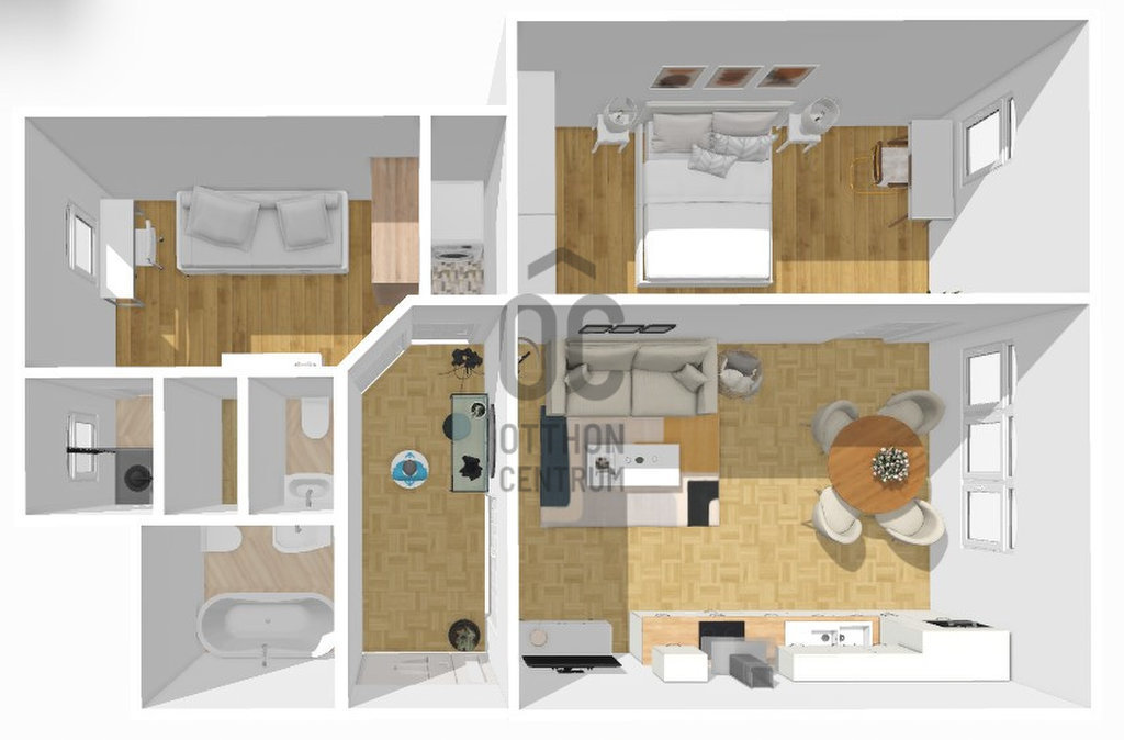 - amerikai konyhás nappali, 2 hálószoba, 2 fürdőszoba, vendég WC, háztartási helyiség
