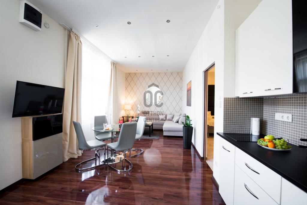 A lakások a legmodernebb konyhai gépekkel és háztartási eszközökkel felszerelt.