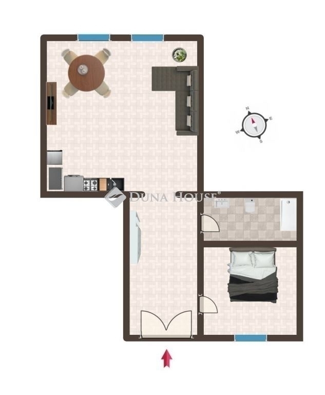 Kiváló elrendezés: Tágas, amerikai konyhás nappali Külön nyíló hálószoba Nagyméretű, ízléses fürdőszoba villanybojlerrel