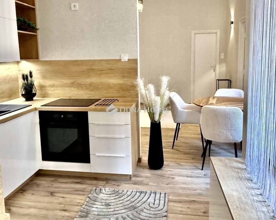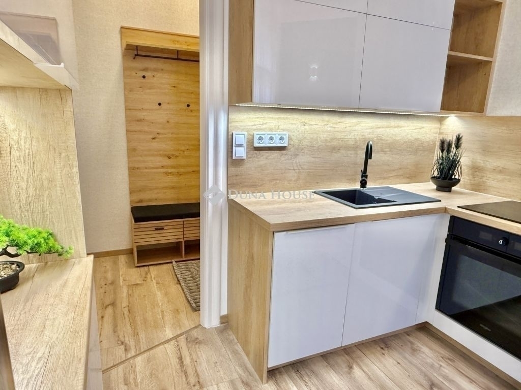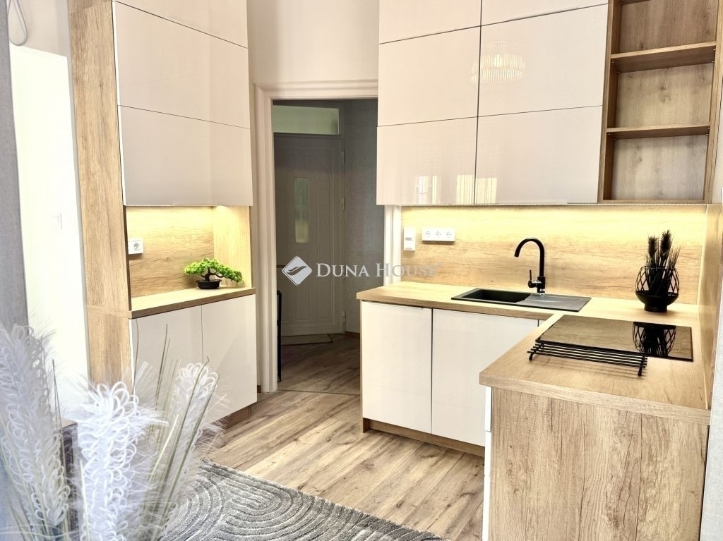 A modern konyhabútor és a hangulatos lámpák mind az ár részét képezik, így a lakás valóban azonnal költözhető.