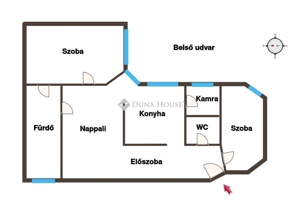 A lakás belső udvarra néz, így a nyüzsgő belvárosi élet mellett csend és nyugalom is biztosított.