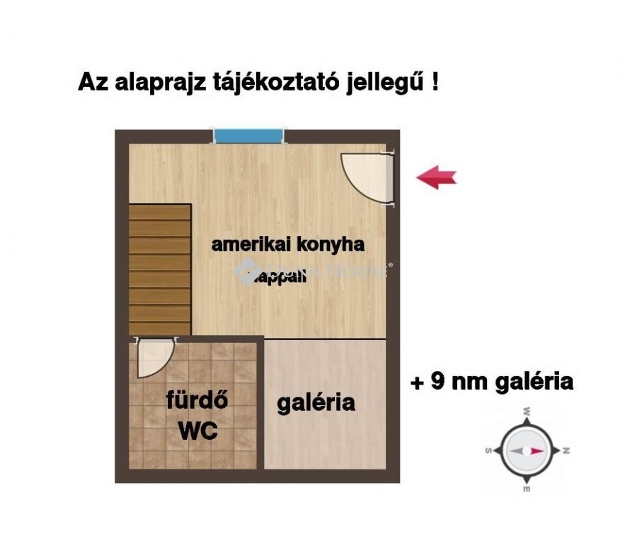 Méreteit tekintve 10 nm alapterületű a lakás, a bejárati ajtón belépve megérkezünk egy amerikai konyhás nappaliba, amelyből nyílik egy teljes értékű fürdőszoba. Innen a lépcsőn felérve egy 9 nm-es álló galéria részre érkezünk, ahol a belmagasság 175 cm. Tehát teljes értékű hálószoba funkciót tölt be.