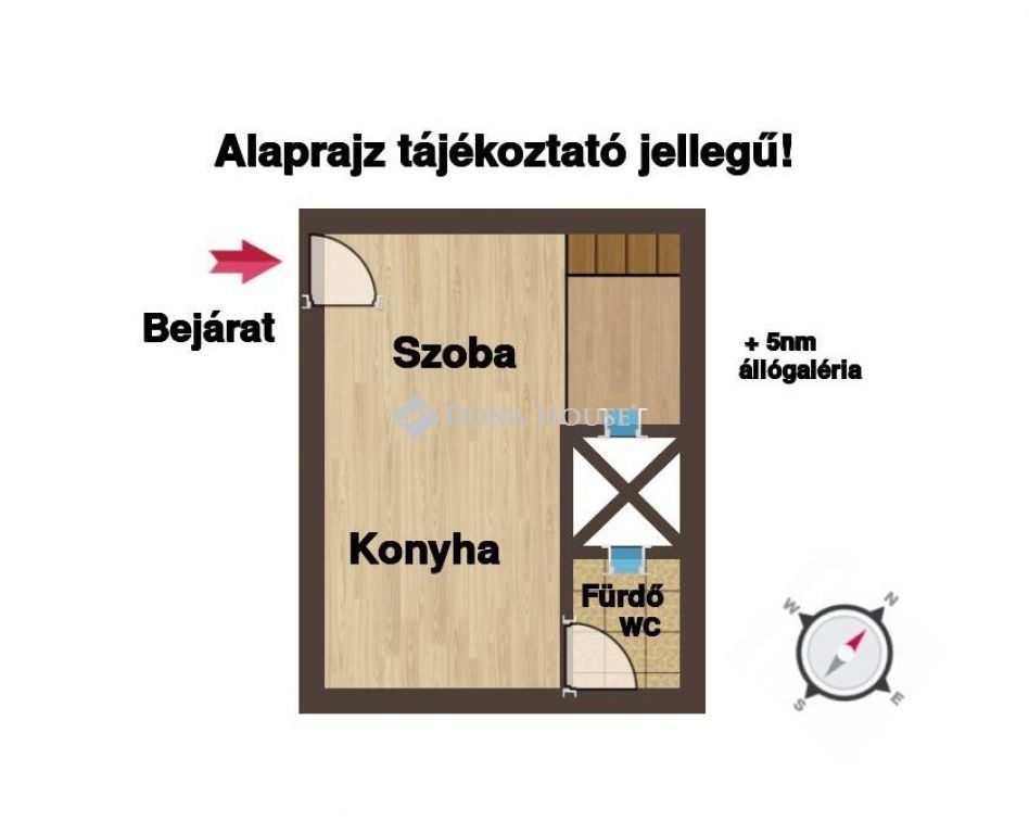 Méreteit tekintve 16 nm alapterületű a lakás, a bejárati ajtón belépve megérkezünk egy amerikai konyhás nappaliba, amelyből nyílik egy teljes értékű fürdőszoba. Innen a lépcsőn felérve egy 5 nm-es álló galéria részre érkezünk, ahol a belmagasság 175 cm. Tehát teljes értékű hálószoba funkciót tölt be.