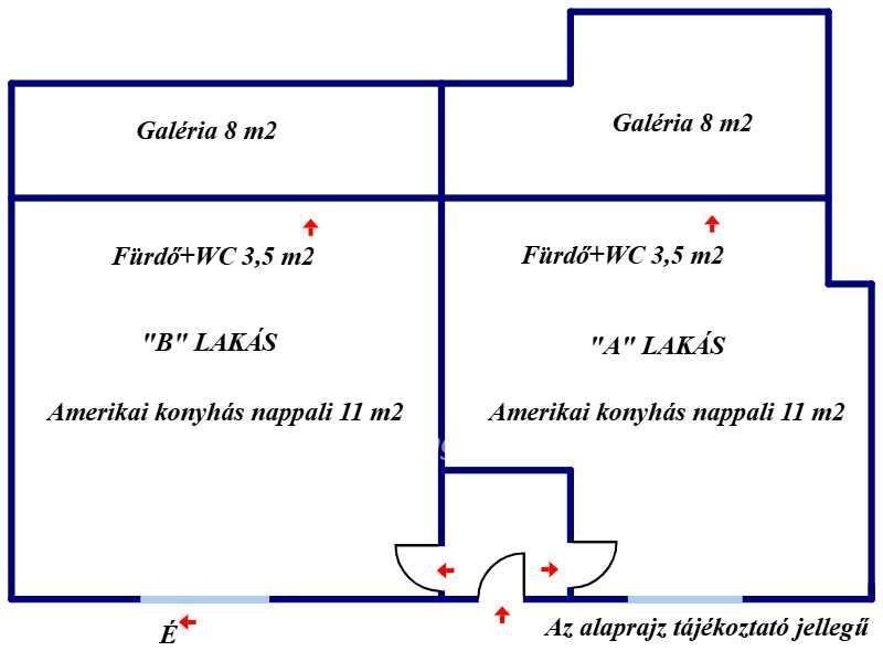 A baloldali lakás hasznos alapterülete: 22 m2 (14+ 8 galéria), a jobboldali lakásé: 23 m2 (15+8 m2 galéria).