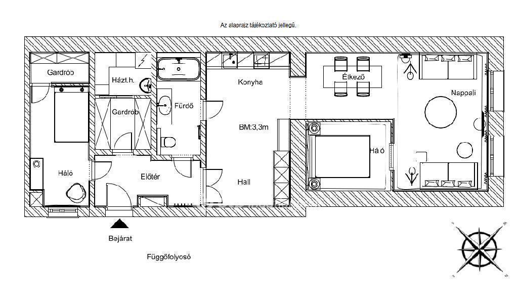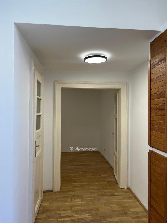 A lakás elosztása: a tágas előszobába lépve jobbra található egy dupla ajtó, ami a hall, nappali, konyha, étkező részbe vezet, ennek nagy ablakai az utcára néznek, ebből a nappaliból lett leválasztva egy hálószoba.