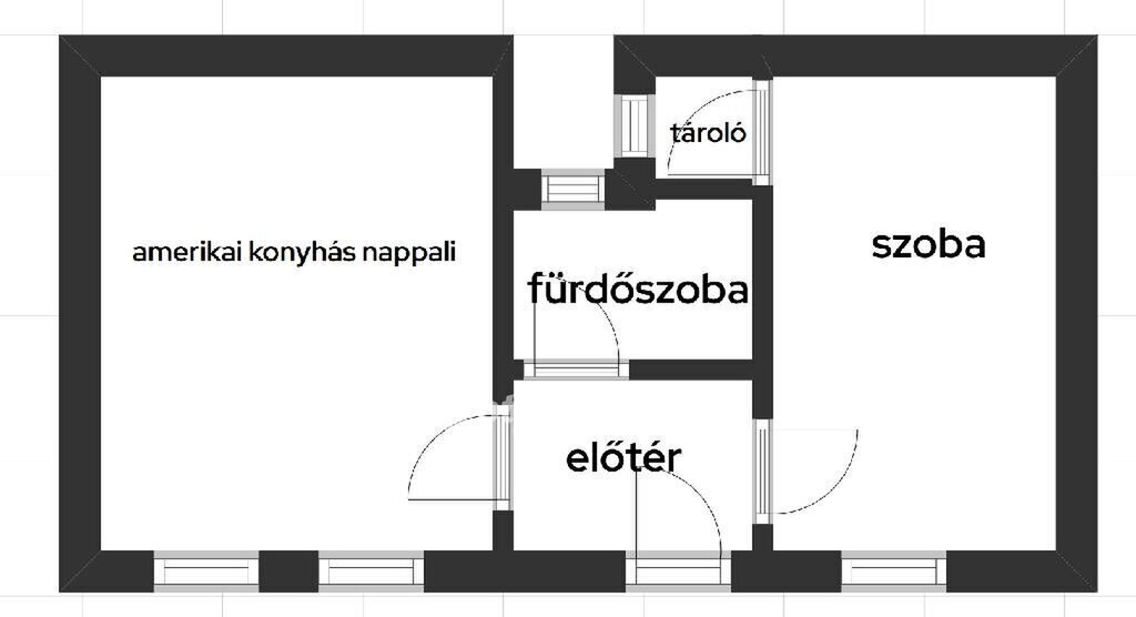 Elosztás: 1 szoba + 1 félszoba (praktikus élettér)
