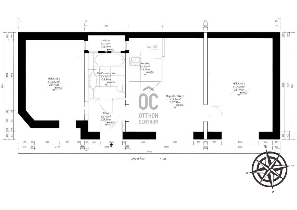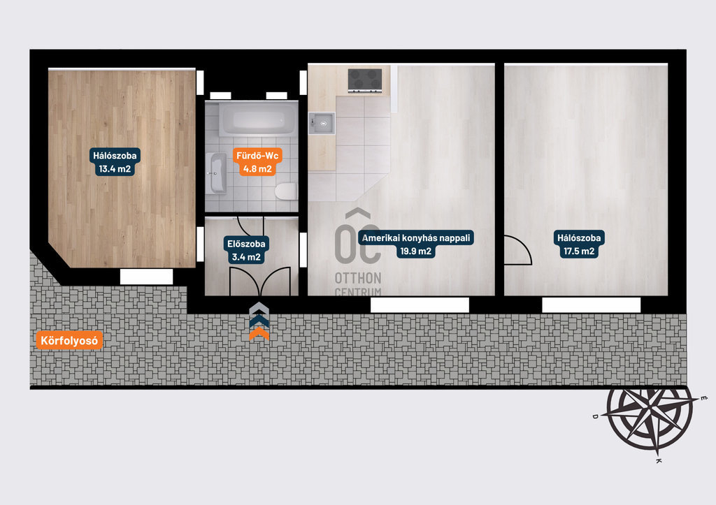 Jelenlegi felosztása: előszoba, amerikai konyhás nappali, 2 hálószoba, fürdőszoba-WC.