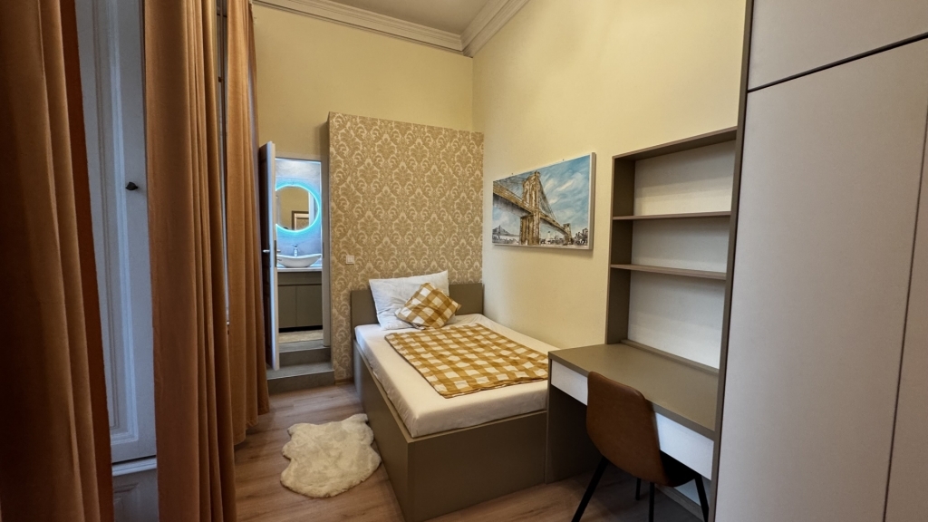 The apartment is characterized by elegant interiors, new, high-quality flooring, and uniquely designed wall surfaces. It comes with a modern, equipped kitchen and two bathrooms with quality tiles and fixtures, each featuring a shower.