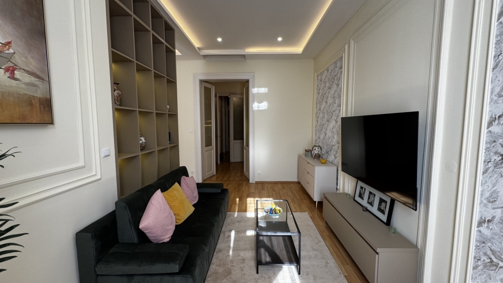 During the renovation, the apartment received new, modern interiors. In addition to the living room, the bright 87 m² apartment includes 3 bedrooms and 2 bathrooms.