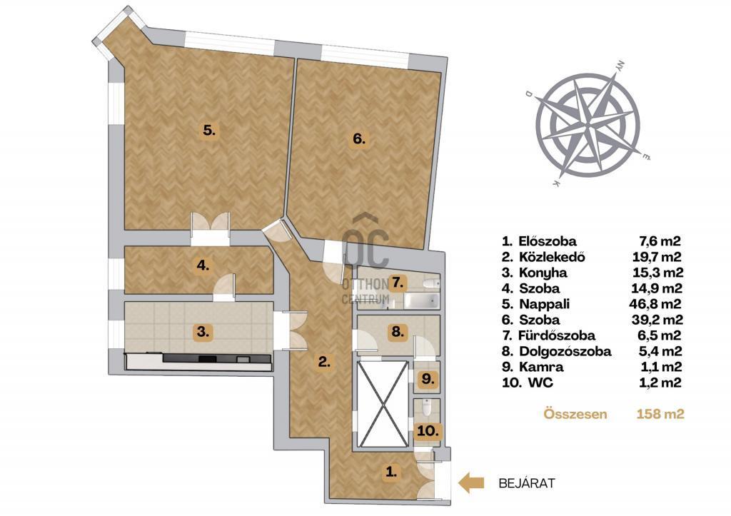 Felosztása: előszoba, közlekedő, 46,8 m²-es nappali, 2 hálószoba + dolgozószoba, konyha, fürdőszoba WC-vel, külön mellékhelyiség.