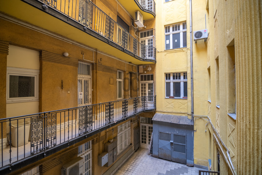 Elhelyezkedése különleges: bár hivatalosan első emeleti, a lakás magassága inkább egy harmadik emeleti lakás érzetét kelti – világos, privát és az utcazajtól hatékonyan védett.