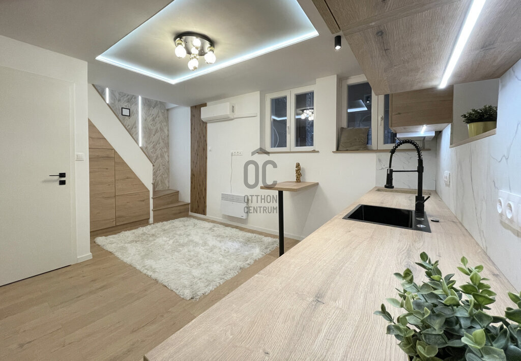 Eladó egy 73 m²-es, igényesen felújított lakás a VI. és VII. kerület határán, tágas terekkel, amerikai konyhás nappalival, 4 méteres belmagassággal és galériás hálószobával. A lakás tulajdoni lap szerint 73 m², a galéria további 6,7 m². A bejárattól jobb kézre van még egy hosszúkás, 7 m²-es tároló helyiség, ami a fotókon nem szerepel.