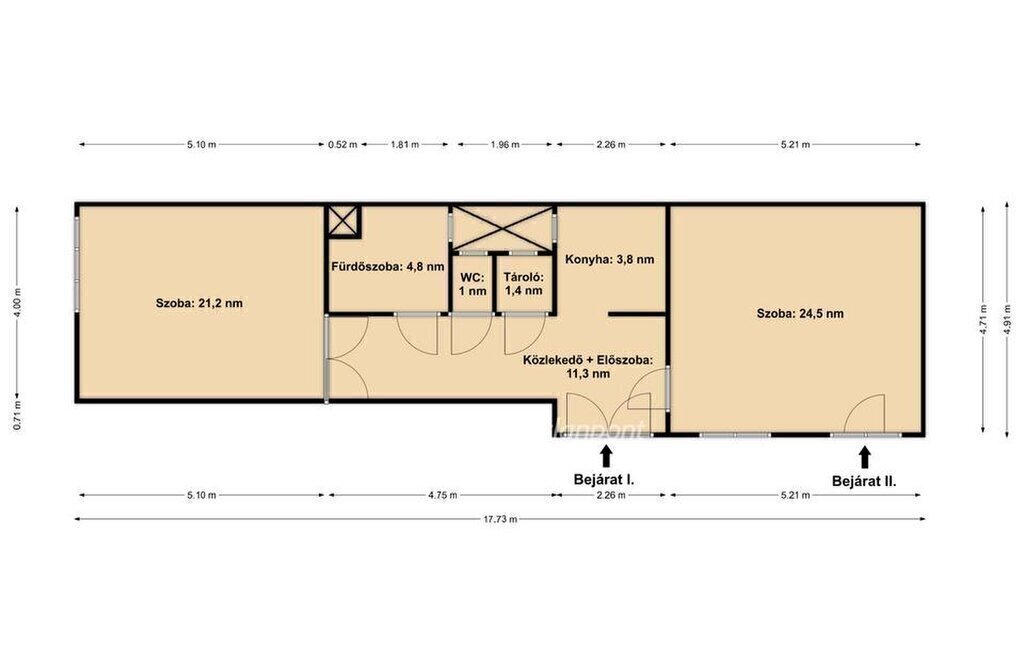 Az ingatlan praktikus elosztású: két külön nyíló szoba, konyha, külön fürdő és WC, valamint tárolóhelyiség található benne. Különlegessége a két bejárat, amely lehetővé teszi akár két külön lakás kialakítását is, így saját célra és befektetésre egyaránt ideális választás.