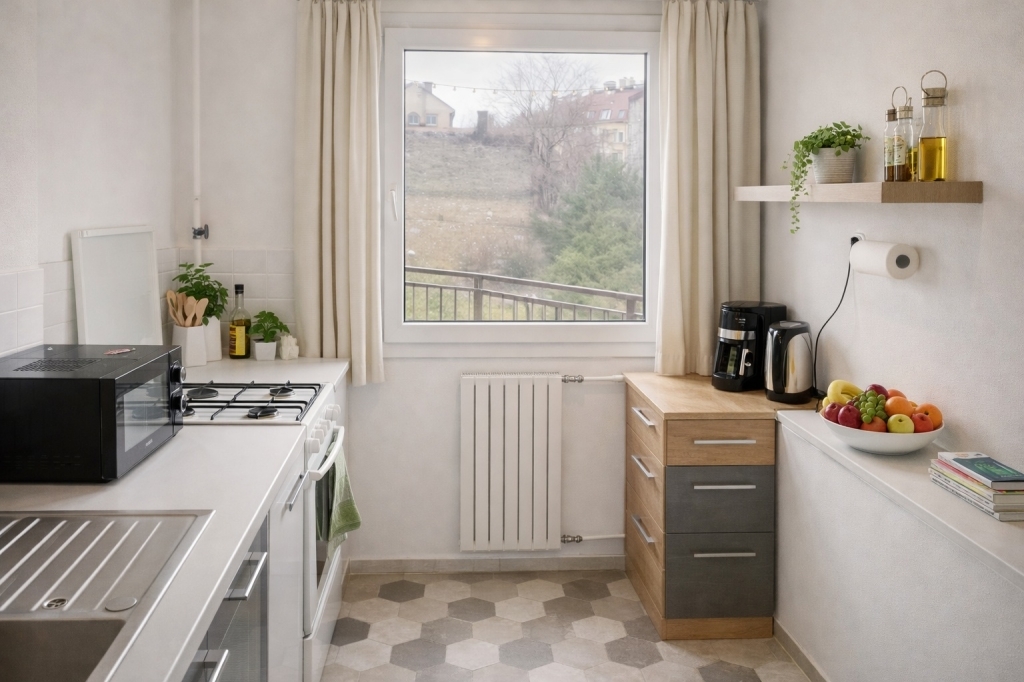 A lakás elrendezése kényelmes és jól átgondolt. A külön nyíló szobák mellett tágas étkező - nappali rész, önálló konyha tárolóval, fürdőszoba, valamint külön WC áll rendelkezésre. A déli tájolásnak köszönhetően a helyiségek egész nap világosak.