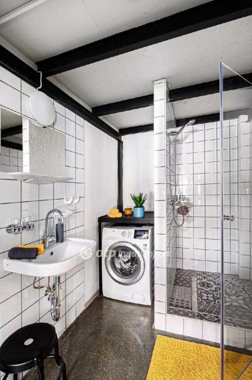 Fürdő & WC: A földszinten kapott helyet a kényelmes zuhanykabinos fürdőszoba, törölközőszárítós radiátorral és mosógéppel, valamint külön helyiségben a WC és egy tároló.