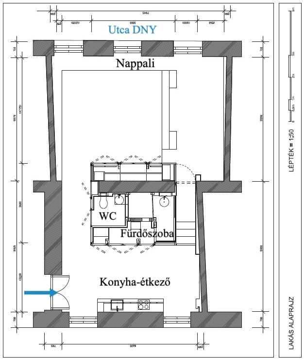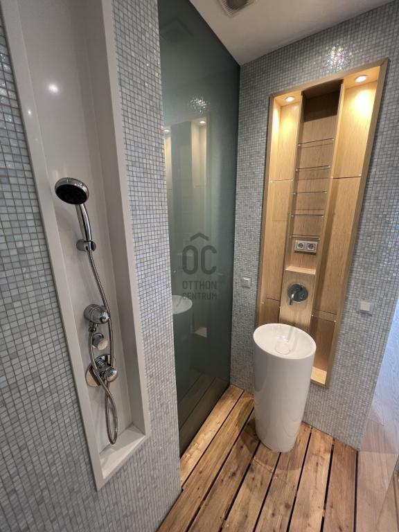 Elrendezés: tágas, egybenyitott tér (eredetileg 2 szobás), exkluzív kialakítással