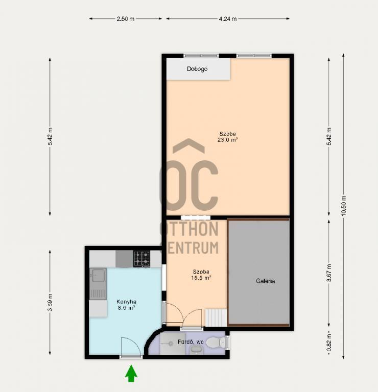 Az ingatlan jelenlegi kialakítása praktikus és több lehetőséget is rejt magában. A világos, utcai nézetű nappali mellett egy korábbi hall átalakításával alakították ki a második szobát, valamint egy nagyméretű galéria is növeli a hasznos alapterületet. A konyha jól kihasználható, minden kézre esik, és egy praktikus átadóablak is segíti a mindennapi használatot. A lakás teljes körű felújítást igényel, így új tulajdonosa saját ízlésének és igényeinek megfelelően alakíthatja ki.