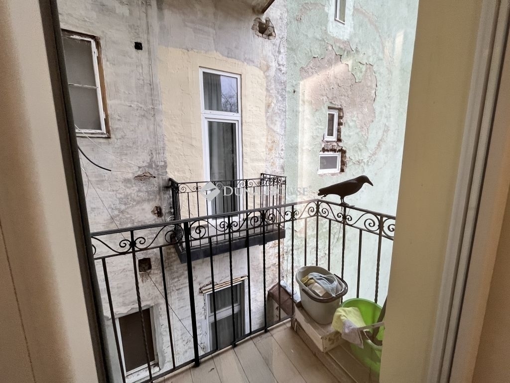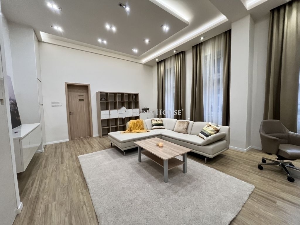 A 68 m²-es, 1. emeleti ingatlan csendes belső udvarra néz, ugyanakkor a dél-nyugati tájolású, nagy ablakoknak köszönhetően rendkívül világos. A lakáshoz egy 1,5 m²-es erkély is tartozik, a belmagasság pedig tovább erősíti a tágas térérzetet.