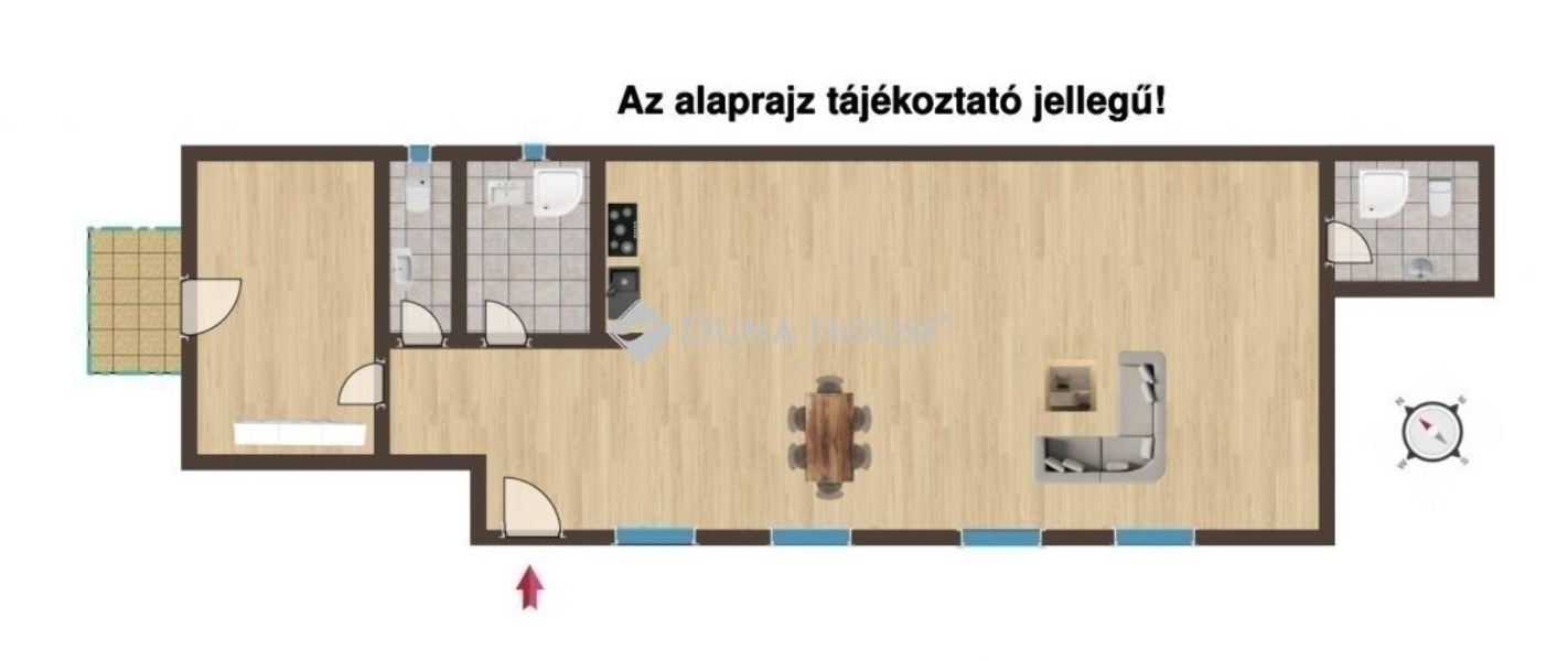 Különleges előnye a két fürdőszoba és a külön WC, amely ritkaságnak számít a környéken. A jelenlegi elrendezésben a nagyobb szoba egybenyitva a nappali-konyhával szolgálja a tágas közösségi tér igényét, ugyanakkor a válaszfal és az ajtó könnyedén visszaépíthető, így 2 hálószobás, 2 fürdőszobás + külön WC-s, nappali-konyhás lakás is kialakítható.