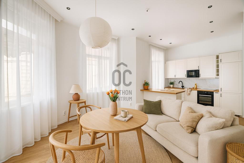 A klasszikus homlokzat mögött egy frissen megálmodott, stílusos lakás nyílik, ahol a múlt eleganciája találkozik azokkal a megoldásokkal, amelyek ma teszik igazán gondtalanná a mindennapokat.