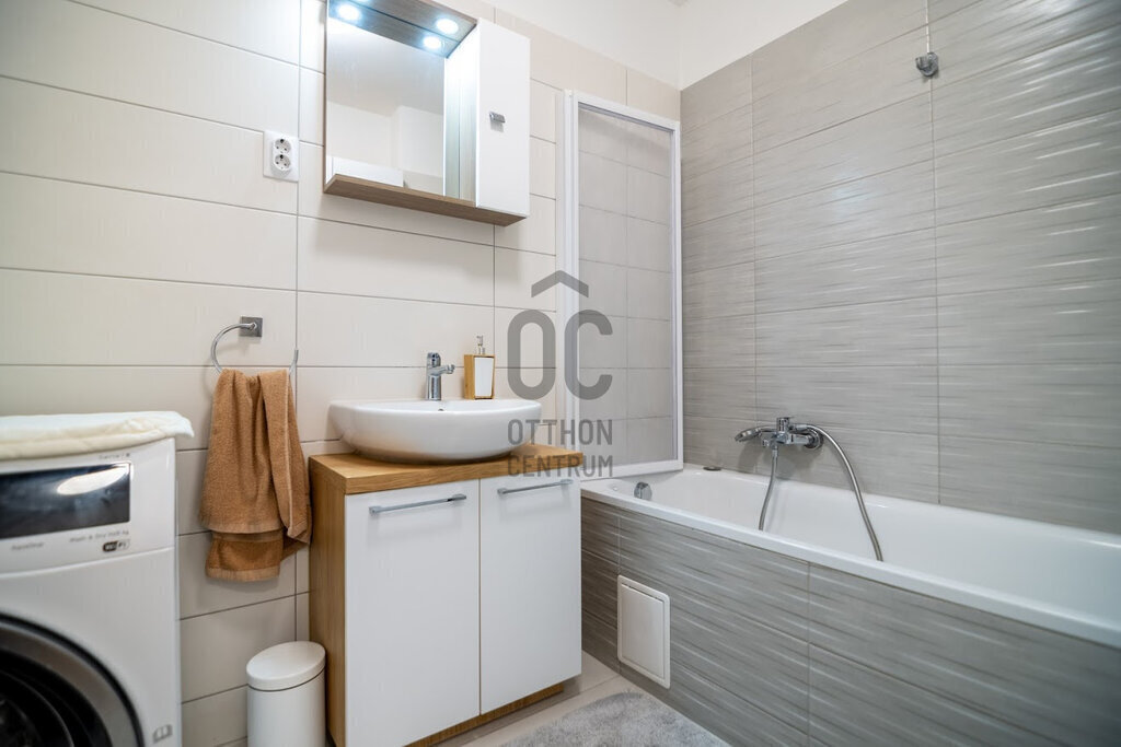 A fürdőszobában kád található, amelyhez zuhanyzó paraván került felszerelésre.