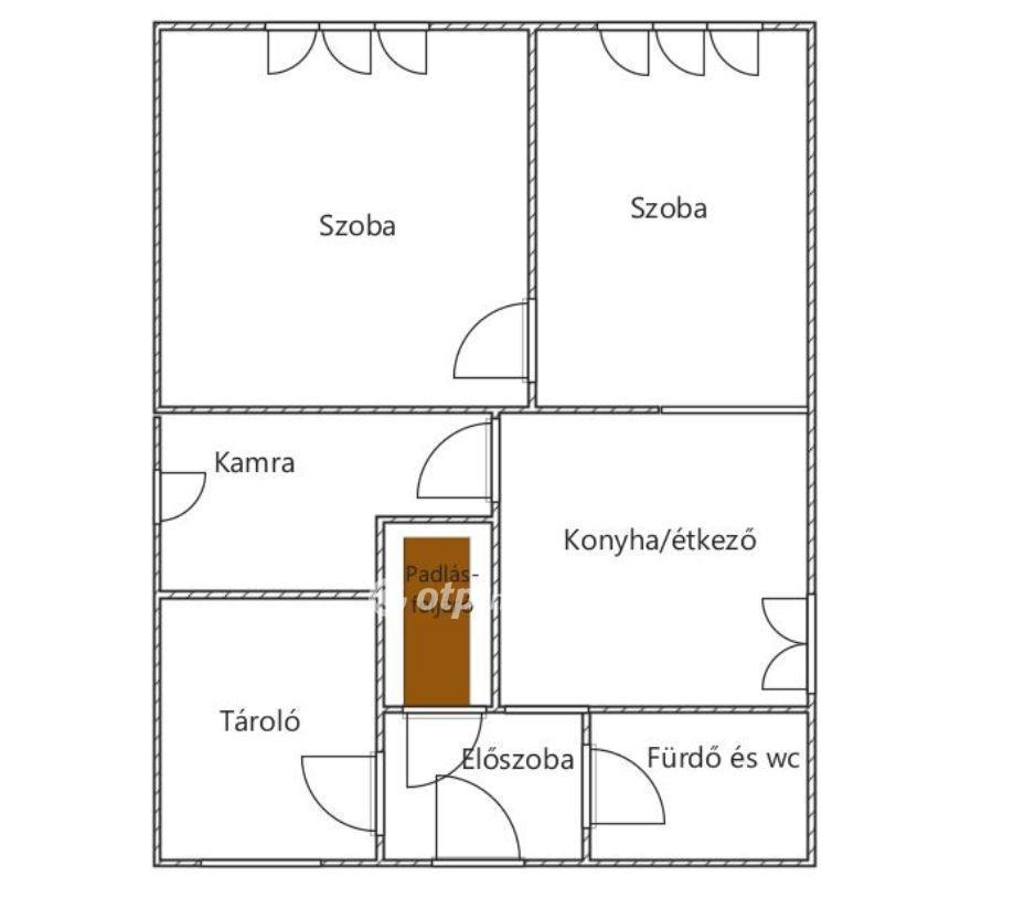 Az ingatlan 2 szoba, előszoba, konyha, nagy kamra, tároló (kazánház), fürdőszoba és wc (egyben) helyiségek és padlásfeljáró található.