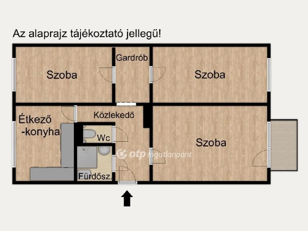 Közlekedő (6,8 m2), 3 külön bejáratú szoba (18,1 m2, 13,4 m2 és 11,2 m2), Gardrób (4,2 m2), Étkező-konyha (9,7 m2), Zuhanyzós fürdőszoba (2,6 m2), Wc (0,9 m2).