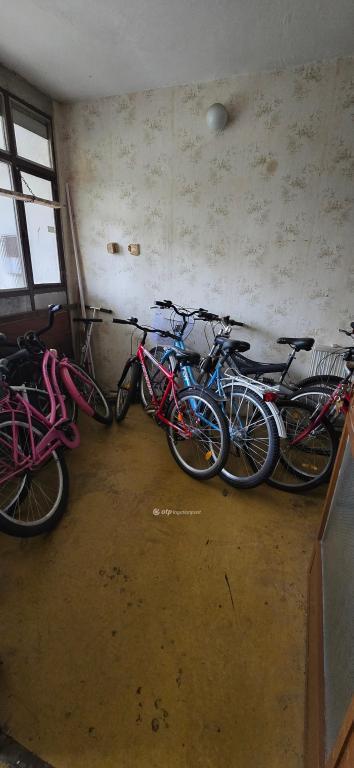 A földszinten van babakocsi tároló, kerékpár tároló, és egy kb 16 m2 tároló amit 3 család használ.