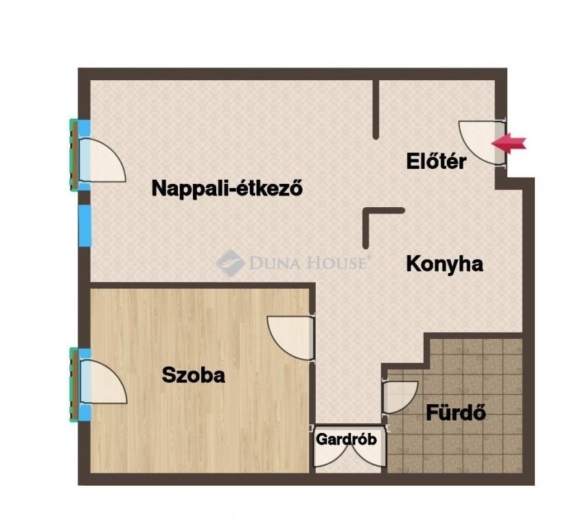 A lakásba lépve a tágas amerikai konyhás nappaliba jutunk, ahol az ebédlő asztal és egy bárpult is helyet kapott. A folyosóról nyílik a hálószoba és a sarokkádas fürdőszoba, amelyben WC is van. Mindkét szobában francia erkély található.