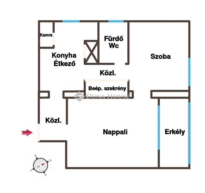 Helyiségek: nappali, szoba, konyha-étkező, kamra, fürdő-wc, közlekedők.