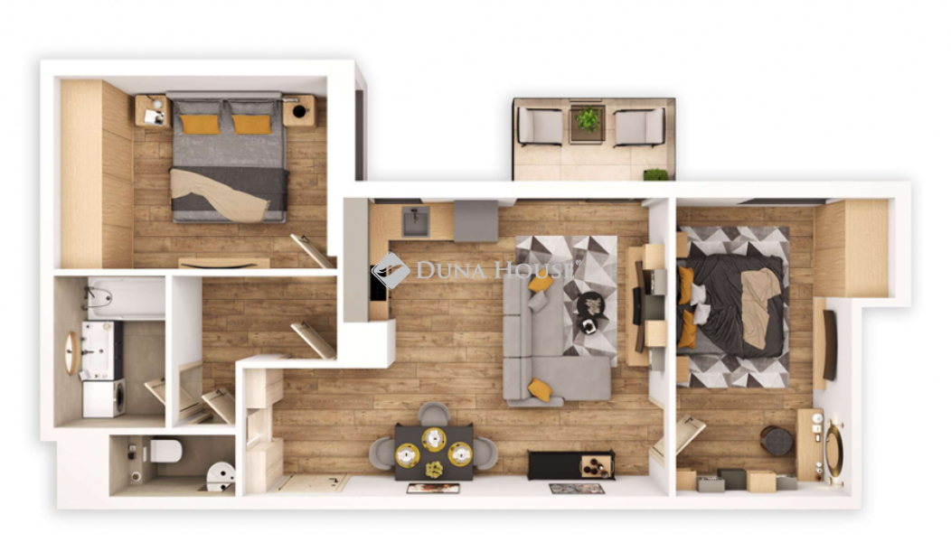 A lakás földszintjén, nappali, konyha, étkező, szoba, előszoba, tároló, zuhanyzós fürdőszoba és egy külön wc található. Az emeleten két szoba, fürdőszoba közlekedő és egy intim tetőterasz 23.33 nm lett kialakítva.