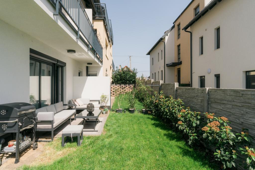 -A burkolt terasz és a zöld kert tökéletes hely a reggeli kávéhoz, délutáni pihenéshez vagy esti baráti grill partikhoz. Saját kerti tároló is rendelkezésre áll.