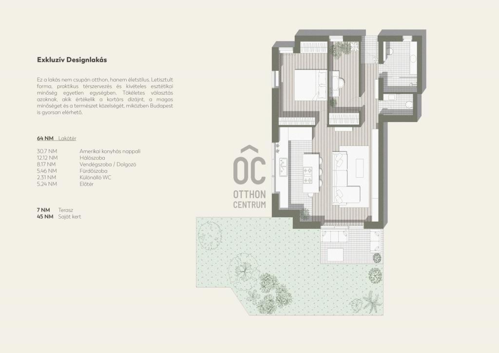 -62 m² lakótér + 7 m² terasz + ~50 m² privát kert