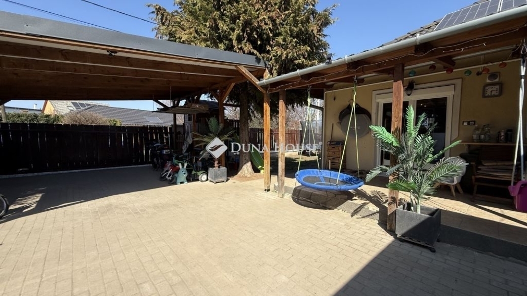 A telek részben térkövezett, rajta elektromos kapuval ellátott, fedett gépkocsibeálló, valamint udvari tárolók és egy egyedi tervezésű játszóvár található.
