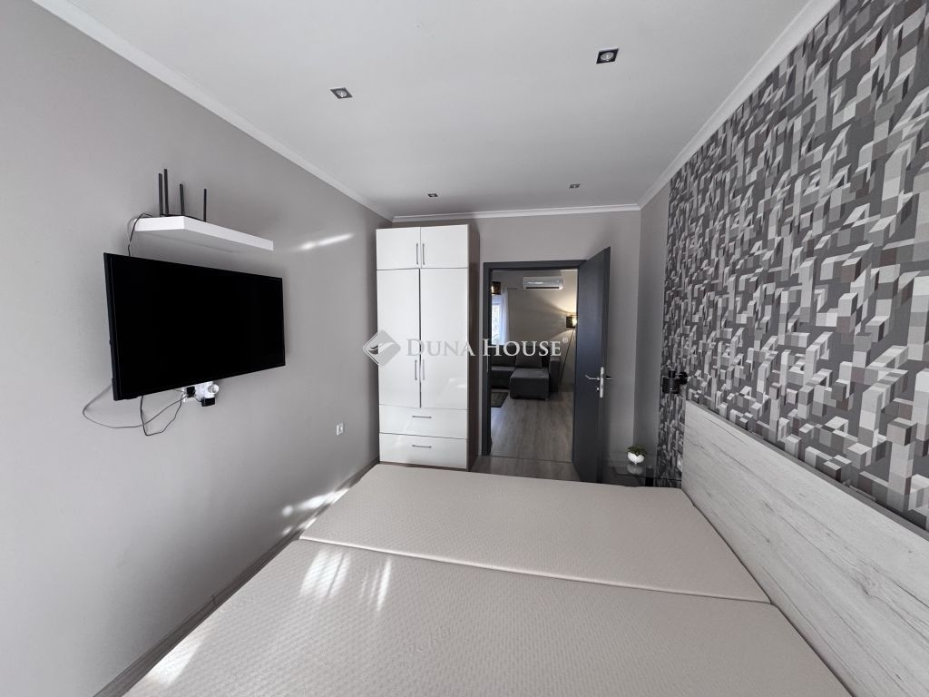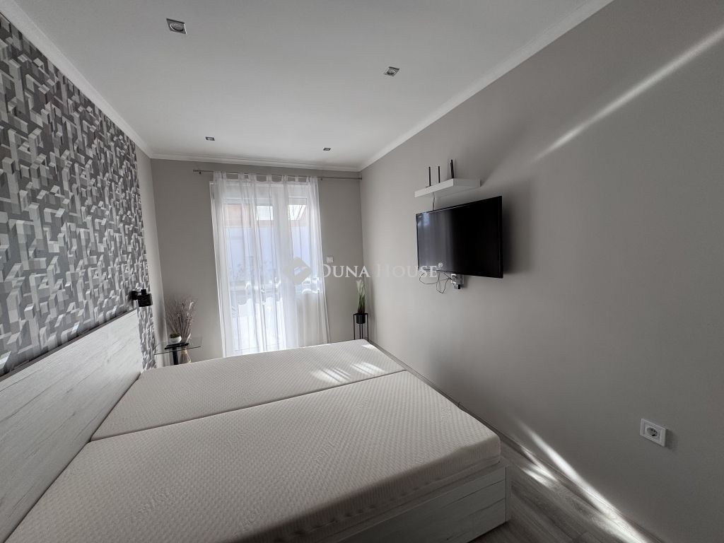 Harkány csendes, rendezett részén, egy háromlakásos társasház földszintjén kínálom megvételre ezt a teljes körűen felújított, kertkapcsolatos lakást, teljes berendezéssel.Az ingatlan minden részlete gondosan megtervezett és karbantartott, a felújítás után gyakorlatilag új állapotban várja leendő tulajdonosát. A lakás fűtése energiatakarékos klímával megoldott, a nyílászárókra elektromos redőnyök és szúnyoghálók kerültek. A ház külső homlokzata 5 cm szigeteléssel, a tető pedig 15 cm kőzetgyapottal ellátott, ami kiváló hőszigetelést biztosít.A lakás teljes bútorzattal és felszereléssel kerül átadásra: a TV, bútorok, háztartási eszközök és minden berendezési tárgy a vételár részét képezi, így az ingatlan akár azonnal költözhető vagy kiadható.A ház előtt egy, akár két autó számára is kényelmes parkolási lehetőség biztosított.Kiváló választás állandó lakhatásra, nyaralónak vagy befektetési célra egyaránt.