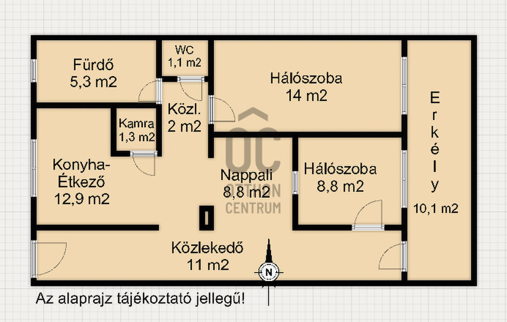 - helyiségek: konyha-étkező, 2 hálószoba+ nappali, közlekedő, kamra, fürdő, külön WC, tágas erkély