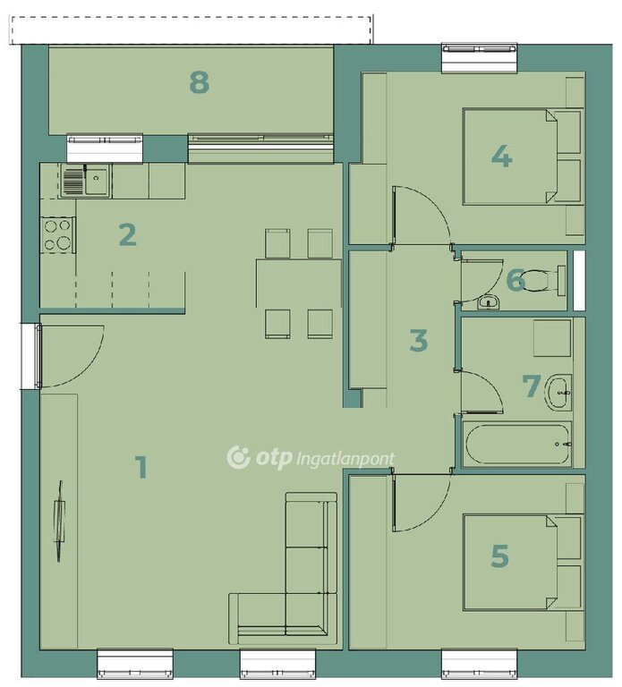 A lakás kialakításánál külön figyelmet kapott a praktikus térszervezés: tágas amerikai konyhás nappali, külön nyíló hálószobák, valamint erkély biztosítja a kényelmes mindennapokat.