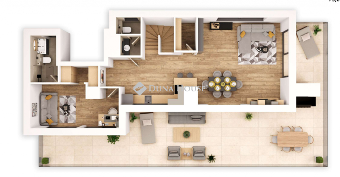 1./1. 54 m2 + 7 m2 fedett terasz + 12 m2 terasz: előtér-lépcsőtér-előtér-konyha+nappali+étkező-hálószoba-fürdő WC-vel.