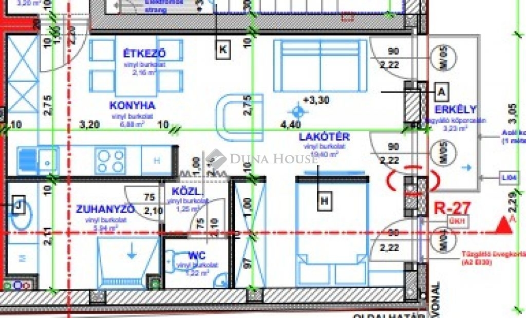 Össz hasznos alapterület: 40,065 m2 (1/2 erkéllyel)