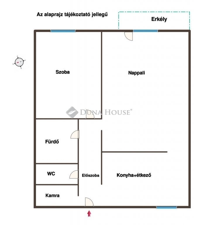 Helyiségek: konyha + étkező, nappali, külön nyíló hálószoba, fürdőszoba, külön WC, kamra, előszoba, erkély