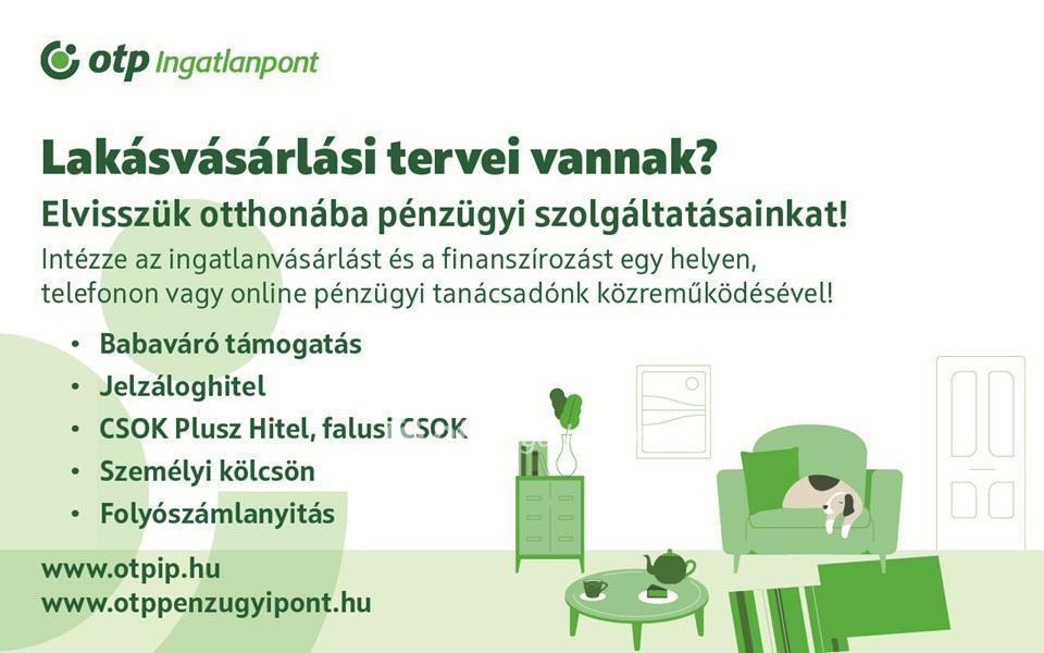 A közelben megtalálható iskola, óvoda, bölcsőde, többféle üzlet, valamint egy modern játszótér is. A tömegközlekedés is könnyen elérhető, néhány perces sétával. Az OTP Ingatlanpont teljeskörű ügyintézéssel áll az eladók és a vevők rendelkezésére! A választott ingatlan finanszírozásához, kedvezményes hitel- és pénzügyi konstrukciókat, hitel megoldásokat kínálunk. Az adásvételi szerződés megkötéséhez igény szerint, megbízható ügyvédi közreműködést és a kapcsolódó ügyek intézéséhez segítséget nyújtunk. Hibás hirdetés bejelentése
