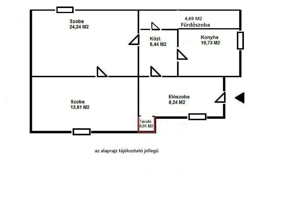 A 70 nm-es, vegyes falazatú házrészben, előszoba, tároló, 2 szoba, konyha, közlekedő, valamint fürdőszoba WC-vel kapott helyet.