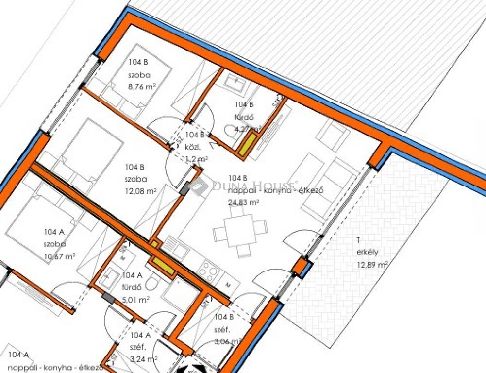 A 104.B számú lakás a hatszintes épület 1.emeletén található. Hasznos alapterülete 54,2 m2, melyben amerikai konyha+ nappali, 1 egész + 1 féll szoba, fürdő, közlekedő és előtér került kialakításra. A környezettel való kapcsolatot a nappaliból elérhető 12,89 m2-es erkély biztosítja.