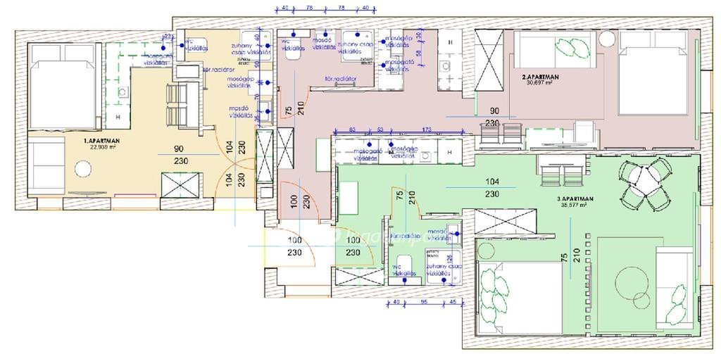 A lakások méretei: 35,6 nm, 30,7 nm és 23 nm. Mindhárom ingatlan amerikai konyhás nappalival és saját fürdőszobával rendelkezik. A szobák laminált parkettával, a többi helyiség járólappal burkolt, a fűtést gáz-cirkó biztosítja.
