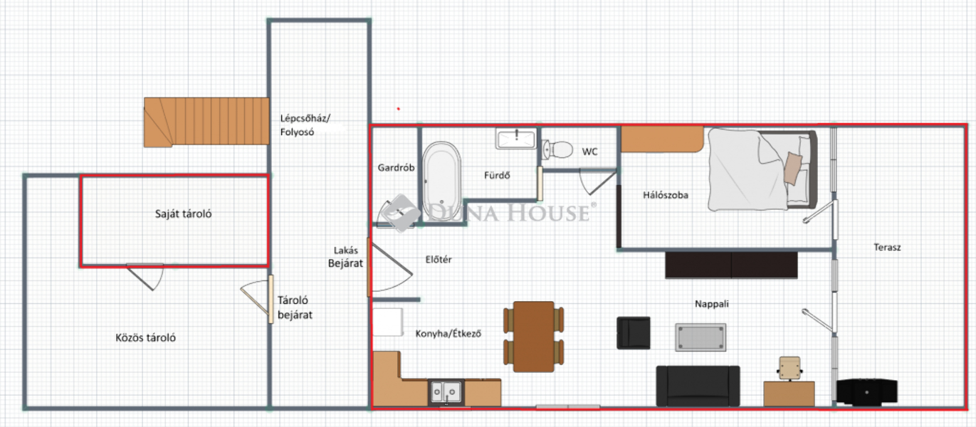 A lakáshoz tartozik egy kb. 6 nm-es tároló a lépcsőházi folyosón