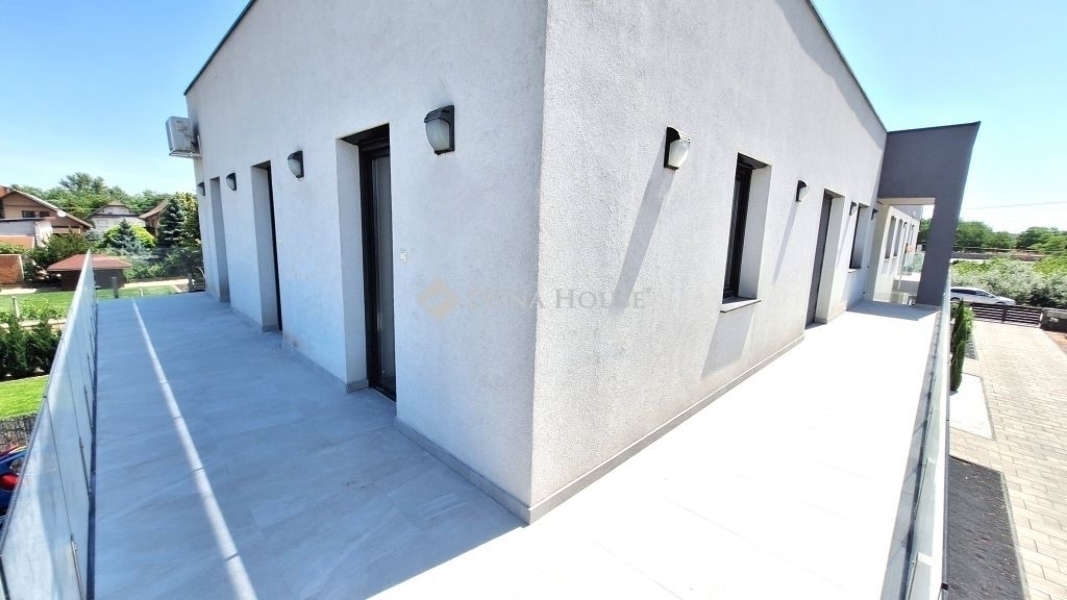 Az otthont egy közel 36 m2-es terasz öleli körbe, így a teraszra nem csupán a nappaliból, de a szobákból is külön ajtó nyílik. A parkolás az épület előtt, illetve a parkosított udvarban is egyaránt lehetséges.