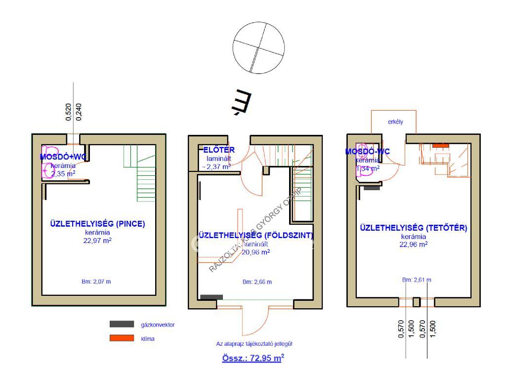 Helyiségek: földszint: üzlettér, előtér-lépcső (23,33 m2); tetőtér: üzlettér, WC-mosdó (25,32 m2); tetőtér: üzlettér, WC-mosdó (24,3 m2).