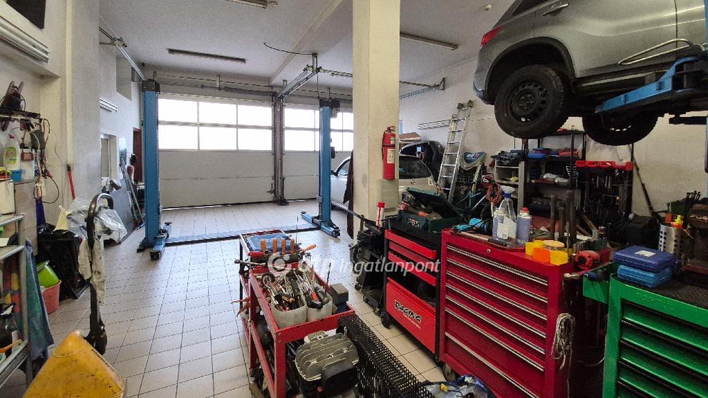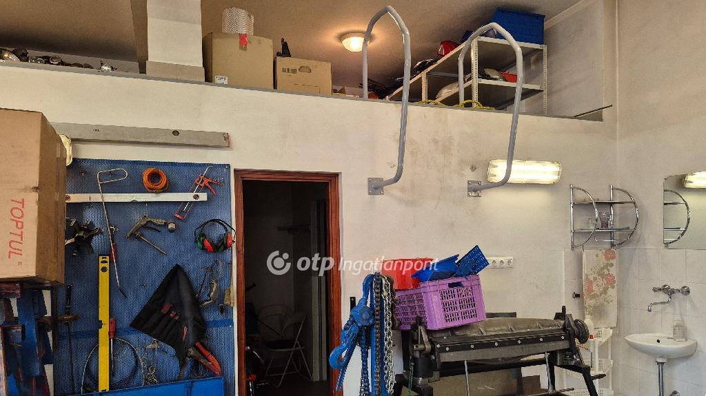 Az utcafrontról a teljesen felszerelt, működő, 4 állásos autószerelő műhelybe 2 szekcionált garázskapun lehet bejutni. Ebből nyílnak a hozzá tartozó kiszolgáló helyiségek: öltöző, zuhanyozó és WC.
