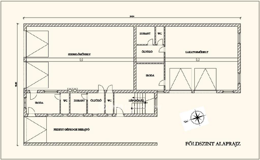 A hátsó udvarban további 2 állásos lakatosműhely van kialakítva csempézett szerelőaknákkal. Ehhez a csarnokhoz is kapcsolódnak vizes helyiségek.
